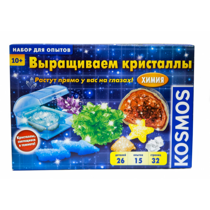 В процессе увлекательных и разнообразных опытов вы сами вырастите настоящие шедевры природы. Откройте и исследуйте многообразие форм и химические особенности! Узнайте все тайны загадочных кристаллов!