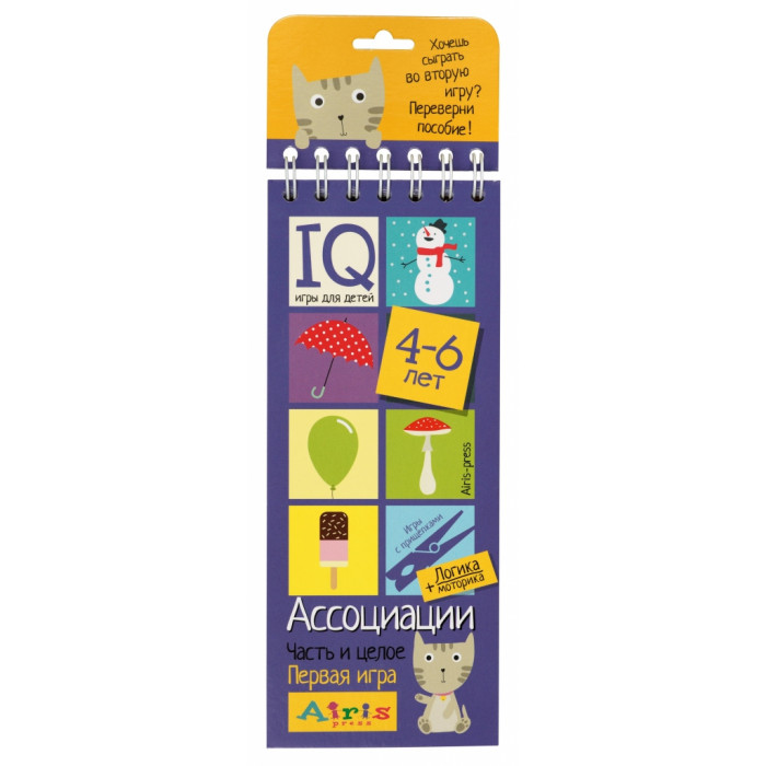 "Ассоциации. Часть и целое" – это игровой комплект для развития ассоциативного мышления, логического мышления и моторики. Комплект представляет собой небольшой блокнот на пружине, состоящий из 30 картонных карточек, и 8 разноцветных прищепок. Выполняя задания на карточках-страничках, ребёнок учится анализировать, сравнивать, искать логические связи. Прикрепляя прищепки и проходя лабиринты, он развивает моторику и координацию движений. Проверить правильность своих ответов ребёнок сможет самостоятельно, просто проводя пальчиком по лабиринтам на оборотной стороне карточек. Простота и удобство комплекта позволяют использовать его в детском саду, дома и на отдыхе.Предназначен для детей старше 4 лет.
