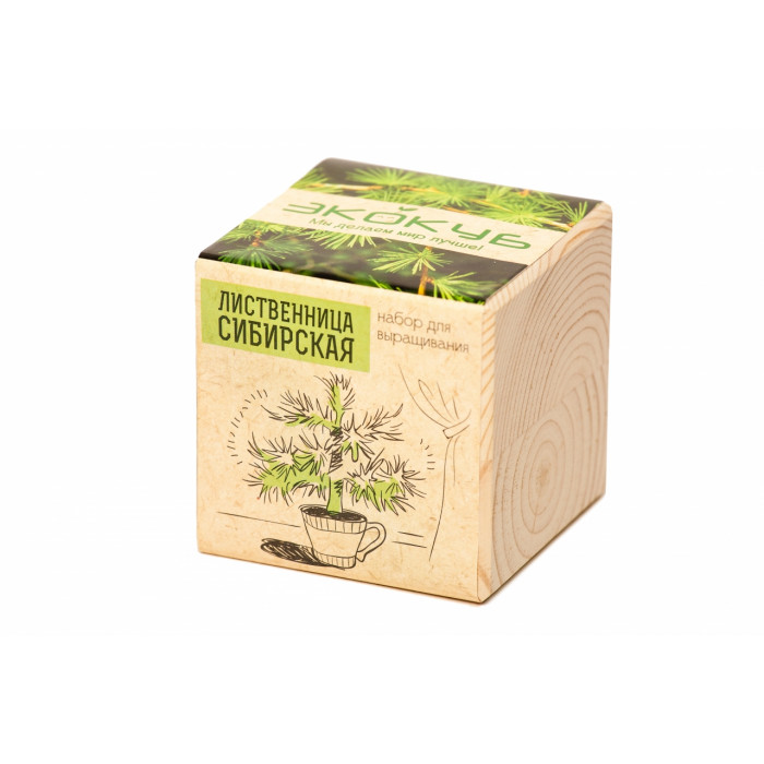 Набор "Экокуб" — удивительная вещь, которая станет необычным украшением дома или оригинальным подарком. С виду это лишь маленький деревянный куб, но все не так просто. На самом деле это экологически чистый кубический "горшок" из натуральной древесины, внутри которого спрятано настоящее деревце! В этом стильном горшочке ожидают своего часа семена красивейшей Сибирской Лиственницы. Это высокое, красивое, быстро растущее, дерево с опадающей на зиму хвоей. Весной хвоя светло-зеленая, осенью — золотисто-желтых тонов. Сибирская Лиственница с древних времен ценится за свою красоту и целебные свойства.