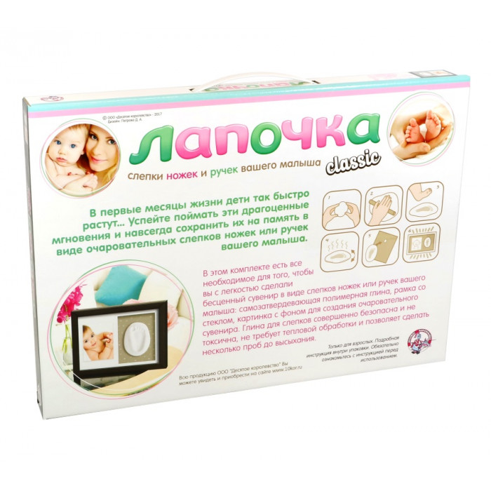"Десятое королевство" предлагает свое недорогое решение для увековечивания бесценных мгновений жизни маленького человечка — набор для изготовления слепков ножек и ручек "Лапочка" с большой рамкой, который является одним из лучших подарков родителям на рождение малыша!