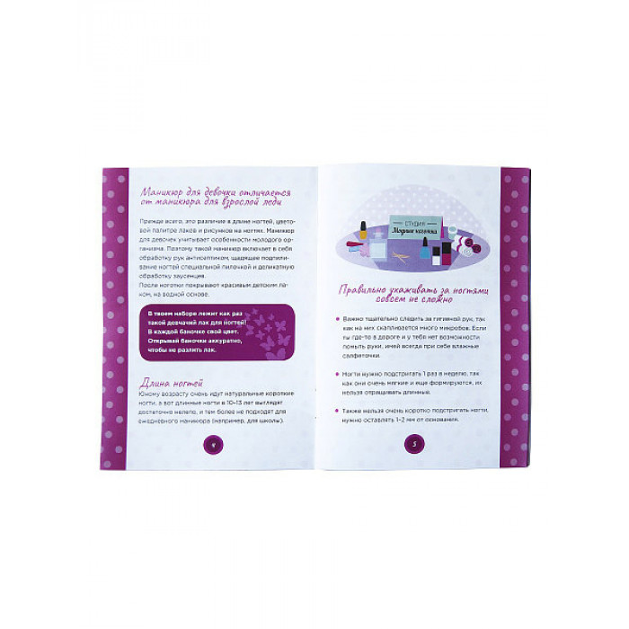 Каждой девочке хочется иметь красивые, ухоженные ноготки. Этому можно научиться благодаря набору, который ты держишь в руках. В наборе есть все, чтобы твои ногти стали стильными, яркими и необычными. В этом тебе поможет специальный тренировочный палец, на котором можно пробовать все новые и новые дизайны.