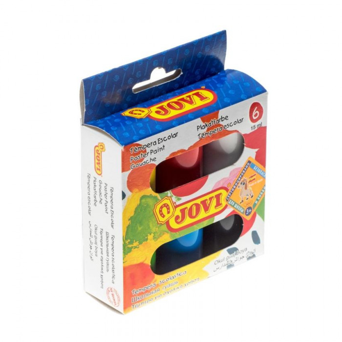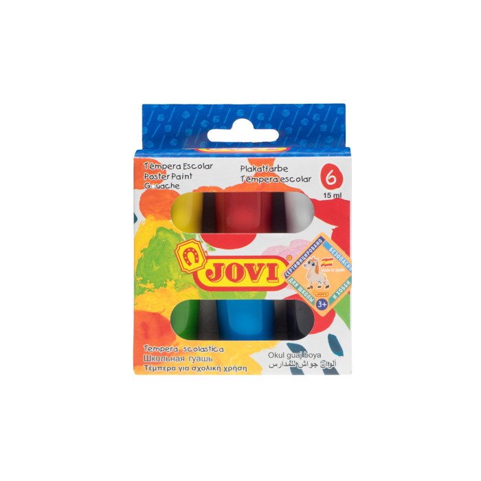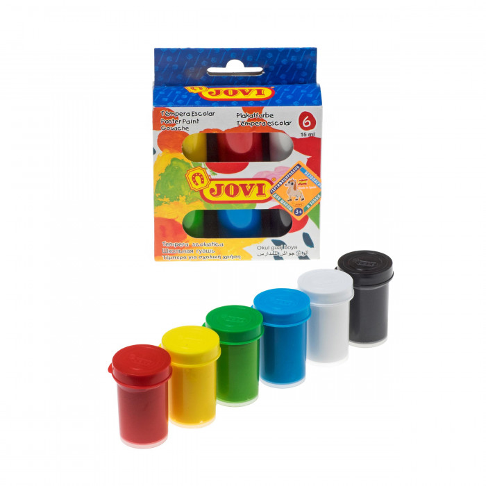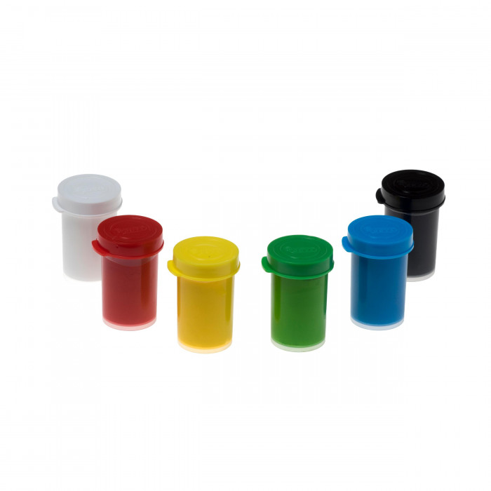 Шесть ярких базовых цветов (белый, желтый, красный, зеленый, синий, черный) в баночках по 15 мл в картонной коробке с европодвесом.