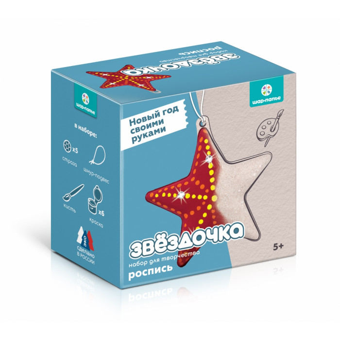 Одна из самых ярких игрушек в наборах от этого тульского производителя - звездочка со стразами. Ее изготовление немного проще, чем изготовление традиционных фигурок от "ШАР-ПАПЬЕ". Не нужно совмещать и склеивать элементы. Но это не значит, что задача для ребенка сильно упрощается. Нужно не просто раскрасить звездочку в яркий цвет, но и аккуратно приклеить на нее сверкающие стразы, которые делают игрушку по-настоящему праздничной. А в этом процессе для малыша самой сложной будет работа с такими мелкими детальками. Умение обращаться с ними - это серьезный шаг на пути к ровному письму в школе, так как работа с очень маленькими предметами - это развитие мелкой моторики рук.