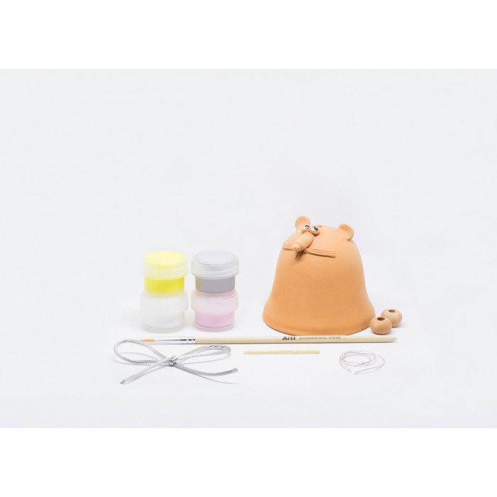 Состав Глиняная основа колокольчика в виде животного; глиняные бусины для будущего колокольчика – 2 шт.; шнурок и нить для колокольчика; деревянная палочка для работы со шнурком; акриловые краски в баночках с закручивающейся крышкой по 5 мл - 4 шт.; кисть; инструкция