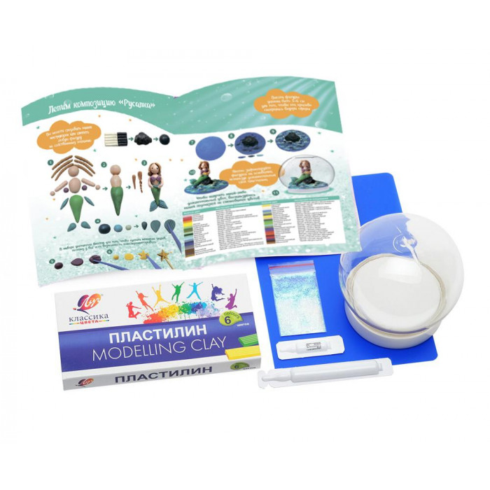 Шар состоит из пластиковой сферы и плотно завинчивающейся крышки, которая не пропускает воду. Слепите фигурку русалки, пользуясь пошаговой инструкцией. Прикрепите готовую композицию к крышке, добавьте в сферу воду с глицерином и блестками, а затем аккуратно соедините две части шара. Ваш Волшебный шар готов! Вы можете дарить его как самостоятельный сувенир, а можете познакомить близких с этим набором для творчества, который научит их новому хобби.