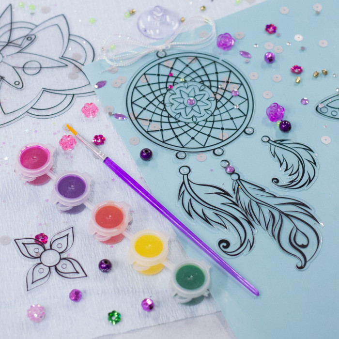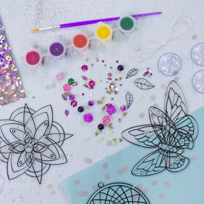 Создай три очаровательных витража и укрась свое окно волшебными красками. Раскрась детали витражей, декорируй стразами, прикрепи к присоске с помощью нити, подвесь бусинки желаний.