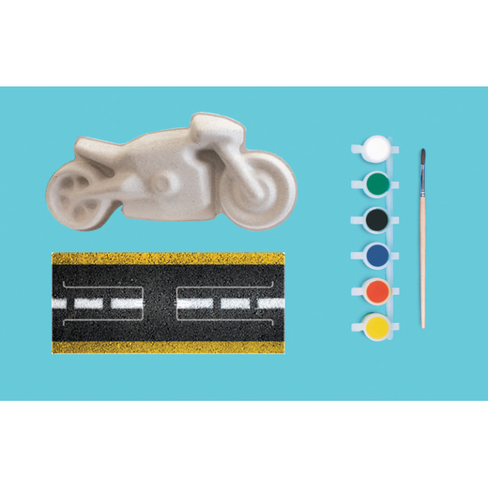 Игрушку можно раскрасить по нашему образцу или придумать свой вариант. Мотоцикл закрепляется на специальной подставке - дороге, которая входит в набор.