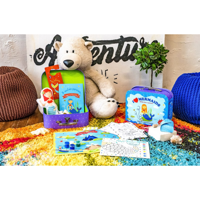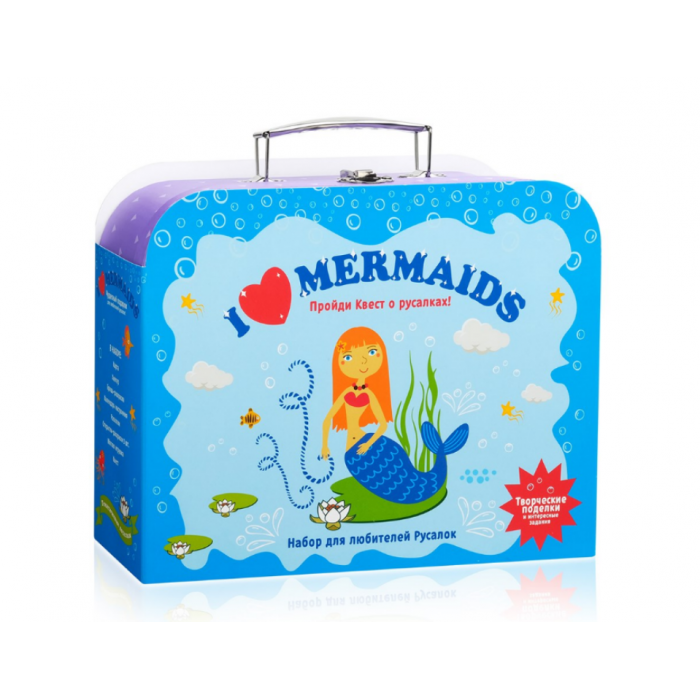 В большом чемоданчике - игровой набор с квестом о стране русалок. Для того чтобы помочь русалкам, надо совершить настоящее путешествие! Дети создадут необычные поделки, сошьют мягкую игрушку, найдут настоящий клад, своими руками сделают красивые украшения и оформят праздничные открытки.