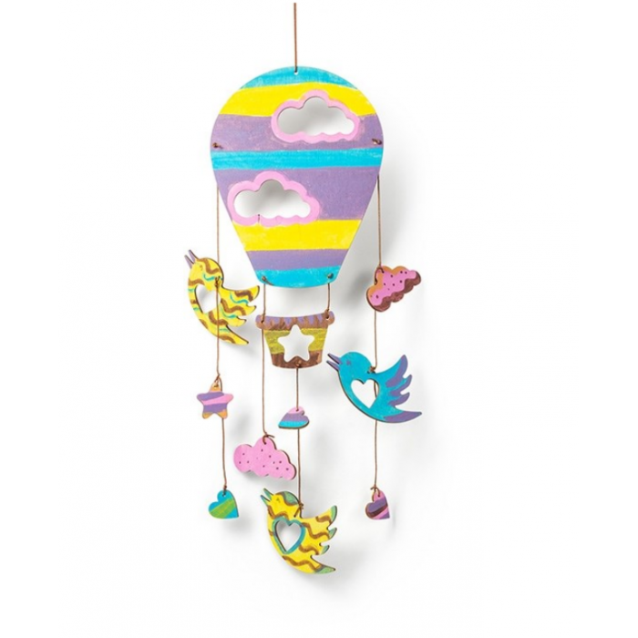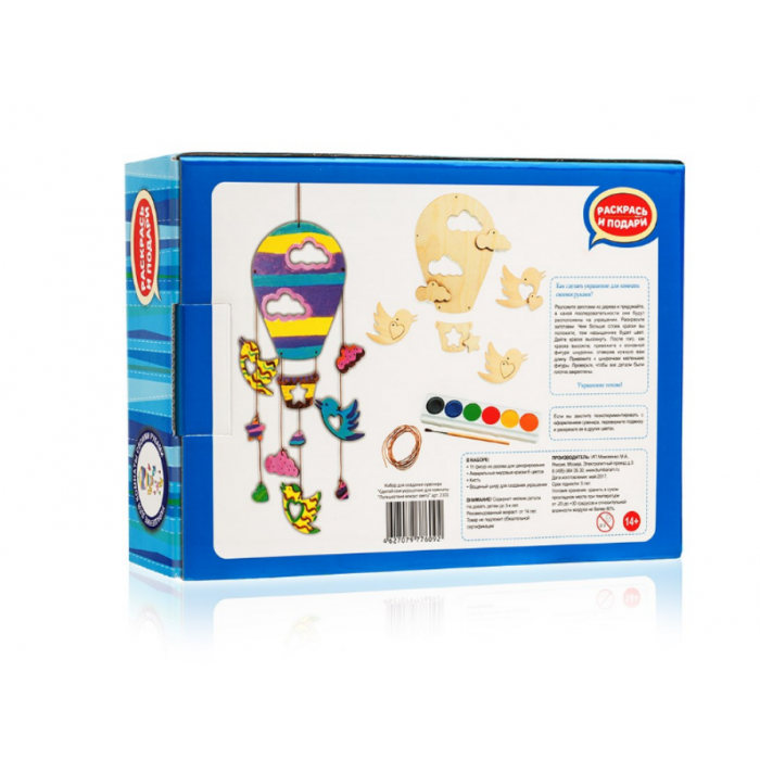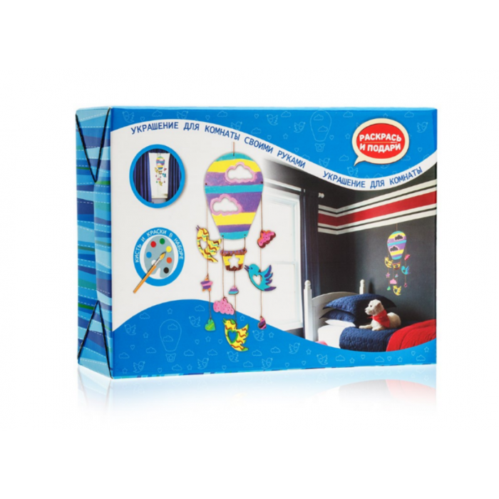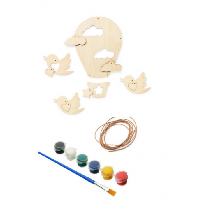Этот волшебный воздушный шар может облететь всю планету и принести в детскую комнату самые яркие сны. С набором "Создай украшение для комнаты" можно создать уникальную подвесную поделку, которая украсит любой интерьер и станет отличным подарком для близкого человека. В наборе вы найдете уже готовые и обработанные деревянные заготовки с отверстиями для шнура, а также краски для росписи украшения.