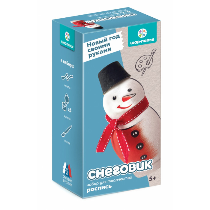 В каждом наборе есть все необходимое для создания игрушки: краски 3 цветов, кисточка и дополнительная фурнитура. Например, ленточка и колпак для завершения образа обаятельного Снеговика.