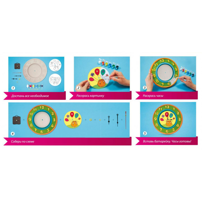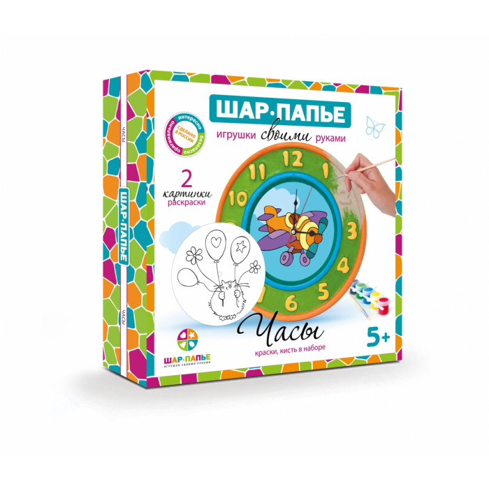 Вставки-раскраски для украшения циферблата (2 шт.) Часовой механизм Краски для раскрашивания часов Кисточка Почему творческие наборы - это новый шаг в развитии ребенка? Изготовление часов из "ШАР-ПАПЬЕ" - это не только развитие творческих способностей вашего ребенка, но и отличный повод изучить, как определять время по часам со стрелками. Для большинства пятилеток (а именно для этого возраста предназначен набор) не вызывает сложности назвать, который час, когда речь идет об электронных часах. А вот стрелки для многих еще вызывают сложности. Вы сможете нанести каждую цифру на циферблат вместе с ребенком и разобрать, что значат такие выражения, как "четверть часа", "половина второго", "без пятнадцати минут двенадцать".