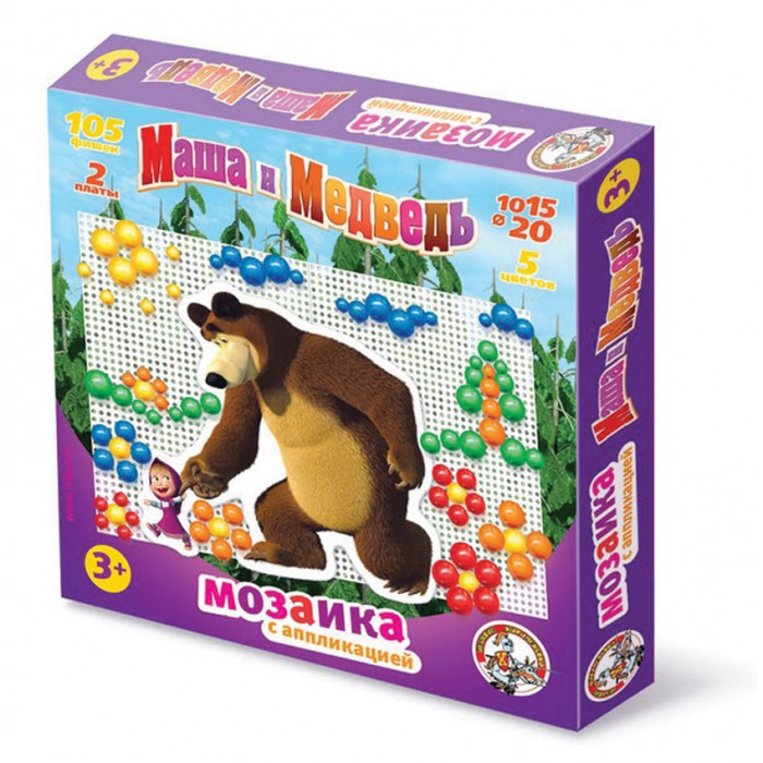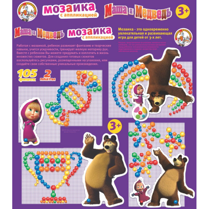 Окунуться в мир необыкновенного творчества — составления мозаики из фишек различных цветов и диаметра, можно с любимыми героями мультсериала — неугомонной Машей и ее другом Медведем.