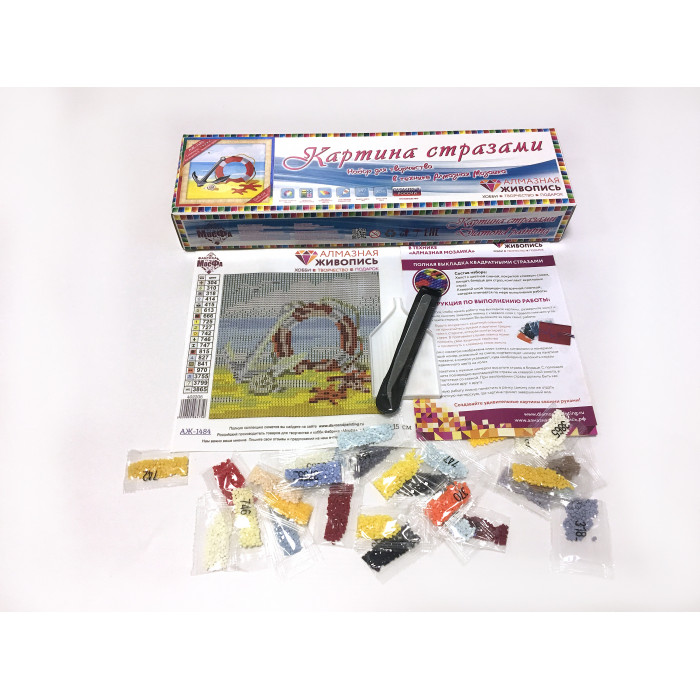 В состав набора входит: пинцет, контейнер для страз, комплект акриловых страз, холст с цветной схемой и клеевым слоем, прикрытый защитной пленкой, инструкция по выполнению работ.