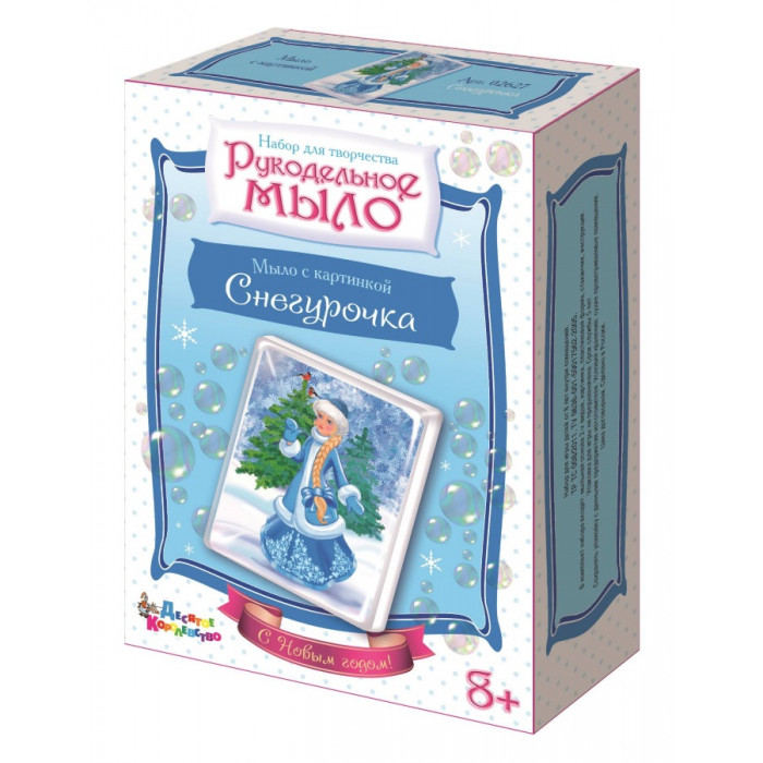 "Снегурочка" серии наборов "Рукодельное мыло" - один из самых красивых наборов с картинкой для изготовления мыла своими руками, который очень нравится девочкам! С его помощью ребенок 8-ми лет и старше сможет сделать приятный подарок своим близким на Новый год. Для этого потребуется внимание, ответственность и строгое соблюдение инструкции. Единственным ограничением является контроль и помощь со стороны взрослых при нагреве и манипуляциях с горячей мыльной основой.