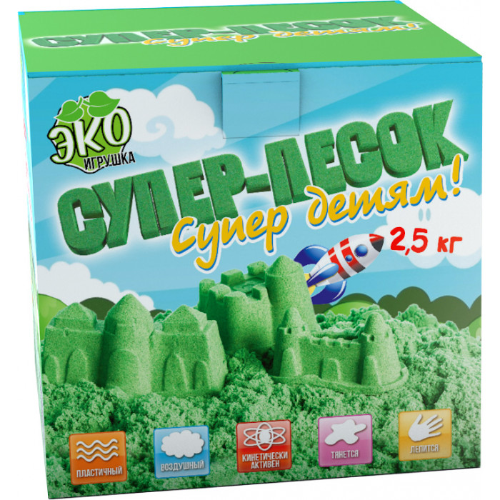 "Супер-песок" похож на влажный морской песок, при этом он сыпучий и пластичный, он "течет" сквозь пальцы и позволят лепить объемные фигуры. Он приятен на ощупь, абсолютно нетоксичен и не вызывает аллергии. Бактерии в нем не живут, поэтому этот песок безопасен для детей.