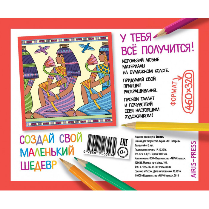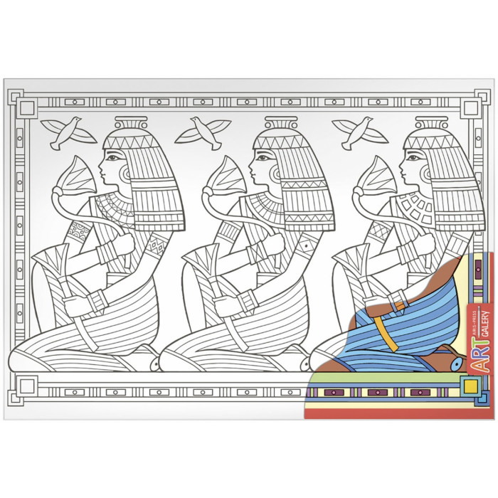 Раскраска "Египет", серии Арт-галерея, предназначена для детей от 3-х лет. Она способствует открытию творческих способностей вашего ребёнка. Основой для раскрашивания является бумажный холст - фактурная бумага, наклеенная на плотный картон, что создает удобство в работе. Возможно использование различных материалов - пластилин, краски, мелки или фломастеры. Вы можете раскрасить картинку, используя образец, или придумать свой вариант. Готовую картину легко повесить на стену или поставить на полку.