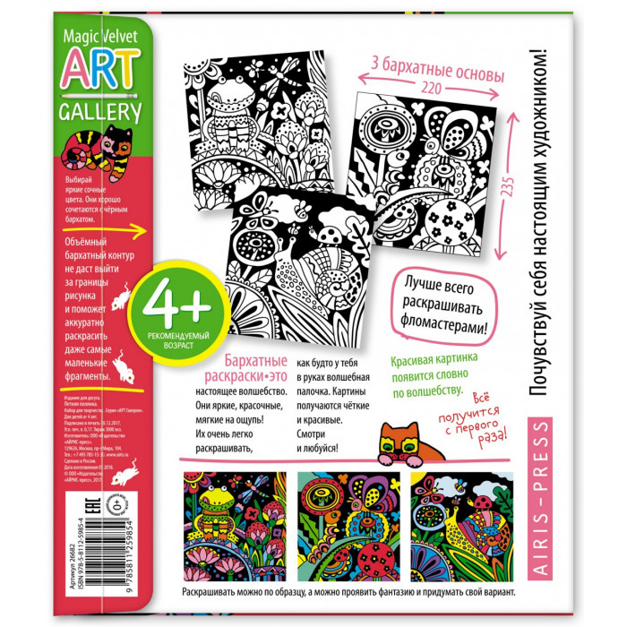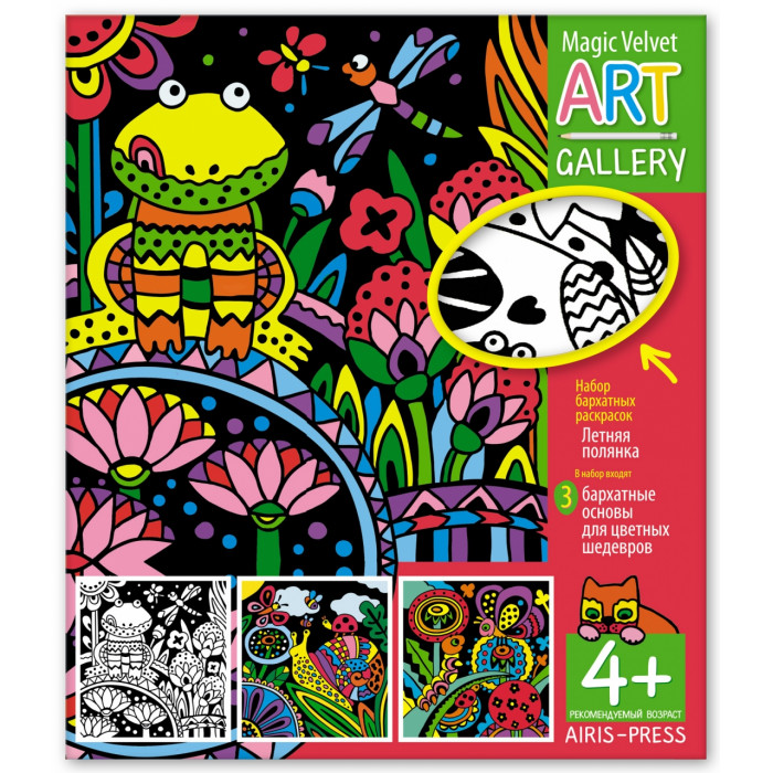 В этом наборе три бархатные основы. Необычные, мягкие и приятные на ощупь. Ребёнок с удовольствием возьмётся раскрашивать, и рисунок обязательно получится красивым. Объёмный контур помогает не выходить за границы рисунка, даже маленькие фрагменты получаются аккуратно. Красивая картинка появляется словно по волшебству.