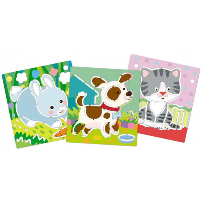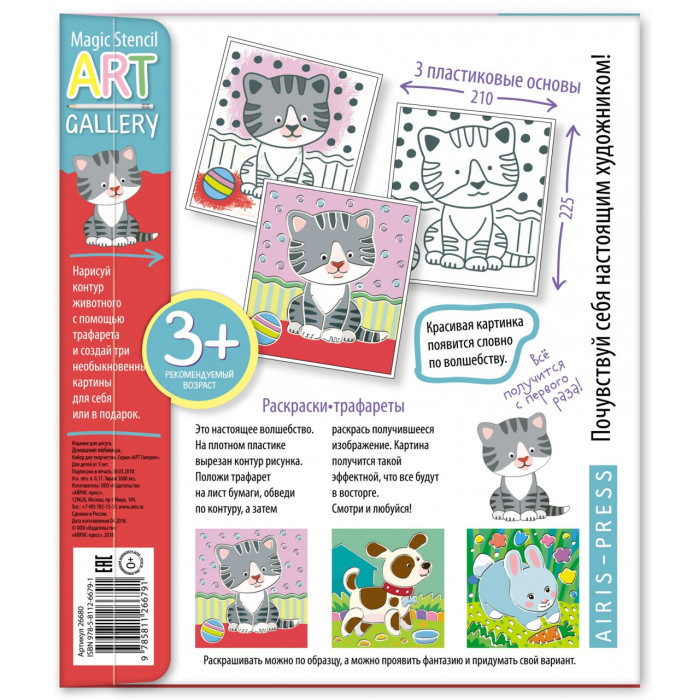Это набор раскрасок-трафаретов для цветных шедевров. С их помощью ребёнок сможет легко нарисовать красивые картинки с домашними любимцами. На плотном пластике вырезан контур рисунка. Просто положите его на лист бумаги, обведите по контуру, а затем раскрасьте получившееся изображение. Можно копировать образец для раскрашивания на обложке или придумать свой вариант. Картина получится аккуратной и эффектной, ребёнок будет в восторге. Рисуйте и любуйтесь!