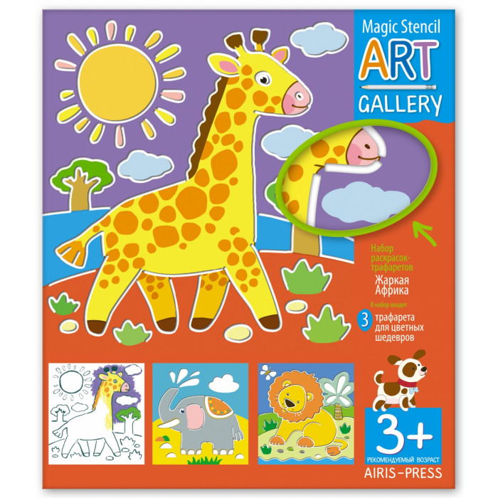 Это набор раскрасок-трафаретов для цветных шедевров. С их помощью ребёнок сможет легко нарисовать красивые картинки с африканскими животными. На плотном пластике вырезан контур рисунка. Просто положите его на лист бумаги, обведите по контуру, а затем раскрасьте получившееся изображение. Можно копировать образец для раскрашивания на обложке или придумать свой вариант. Картина получится аккуратной и эффектной, ребёнок будет в восторге. Рисуйте и любуйтесь!