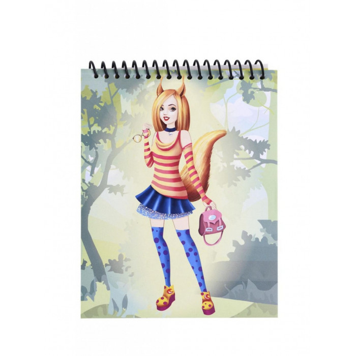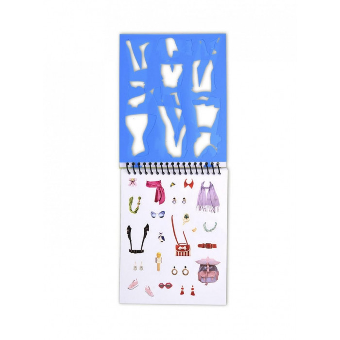 В блокноте множество эскизов, которые можно раскрасить карандашами, дополнить элементами одежды с помощью трафаретов и украсить аксессуарами-стикерами.