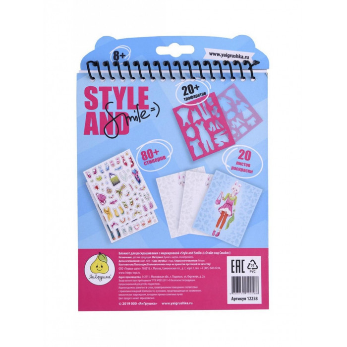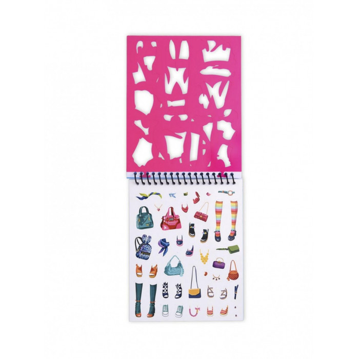 В блокноте множество эскизов, которые можно раскрасить карандашами, дополнить элементами одежды с помощью трафаретов и украсить аксессуарами-стикерами.