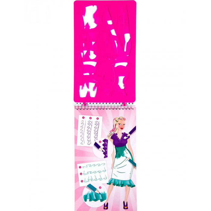 В блокноте множество эскизов, которые можно раскрасить карандашами, дополнить элементами одежды с помощью трафаретов и украсить аксессуарами-стикерами.
