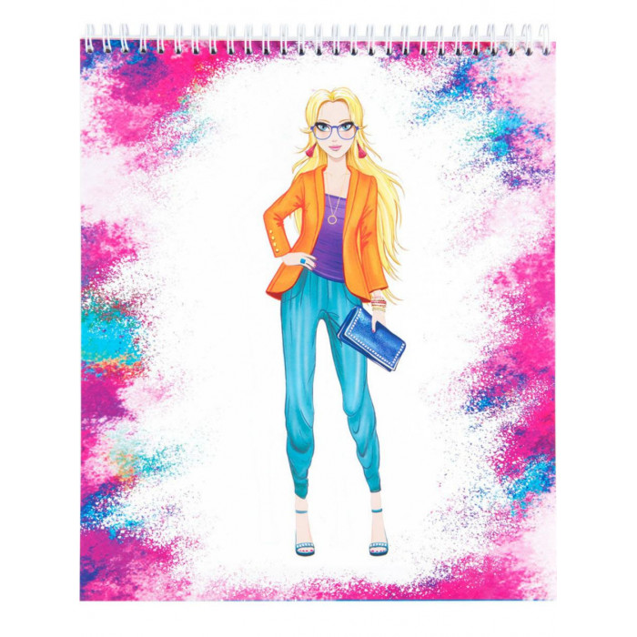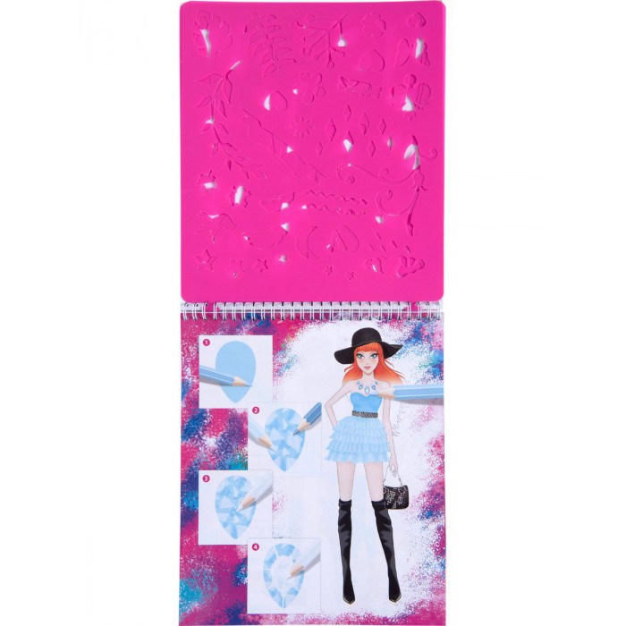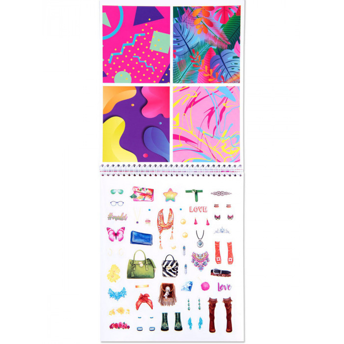 В блокноте множество эскизов, которые можно раскрасить карандашами, дополнить элементами одежды с помощью трафаретов и украсить аксессуарами-стикерами.