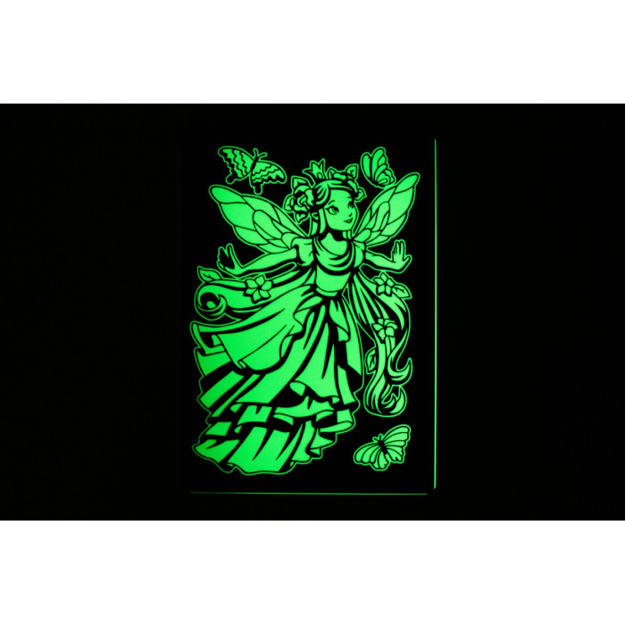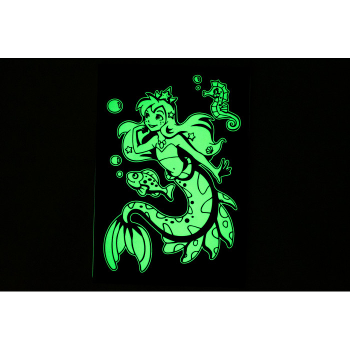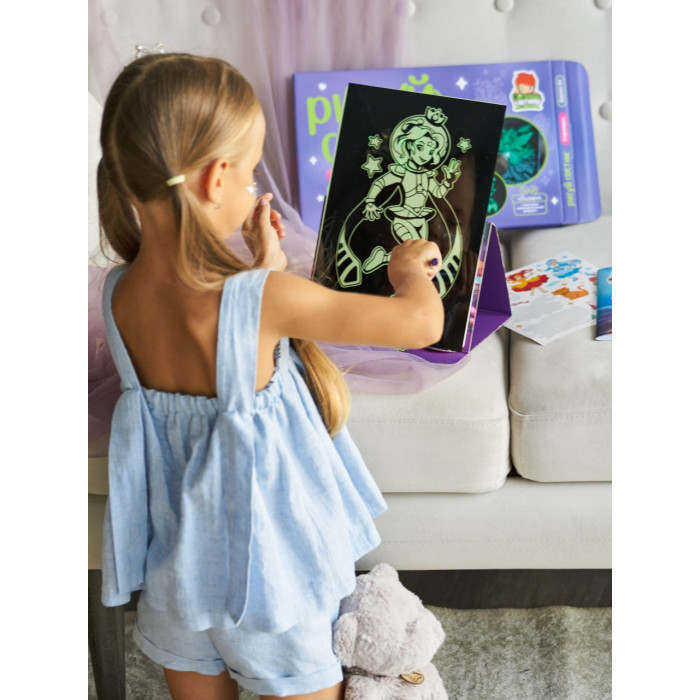 Большие трафареты превращаются в ночник: нужно поставить планшет с трафаретом на подставку, засветить под любой лампой в течение 10-15 мин., убрать трафарет и выключить свет. Каждый вечер ребенка будет радовать новая светящаяся в темноте картина.