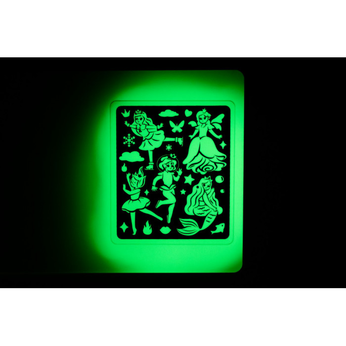 Можно рисовать светом принцесс по 5 большим трафаретам формата А4. На каждом из них изображено по одной принцессе — Аква, Искорка, Льдинка, Венера, Лилия. На небольшом трафарете (11×13 см) находятся одновременно все принцессы.