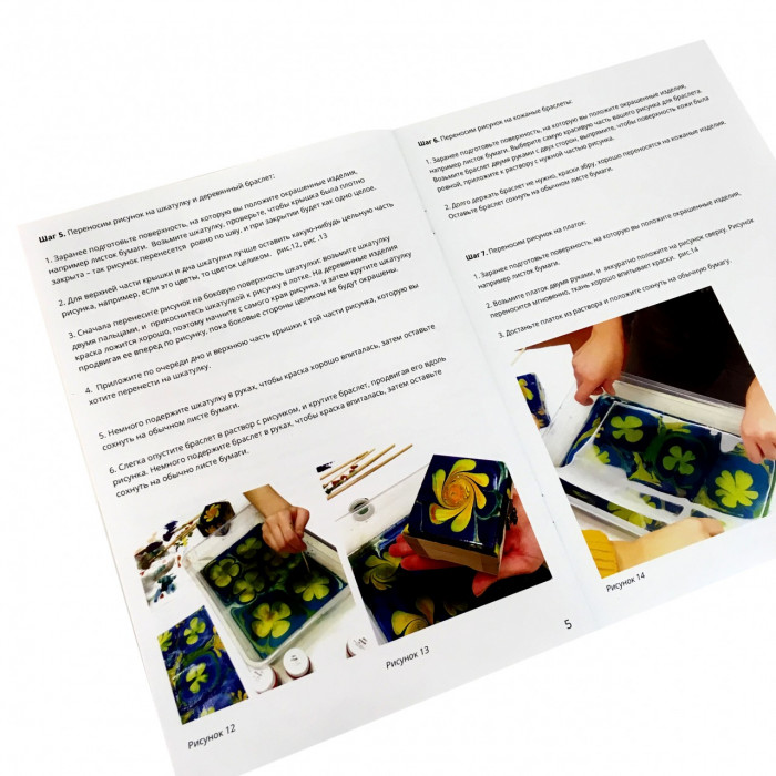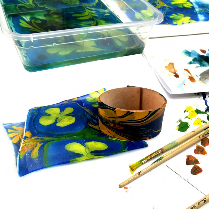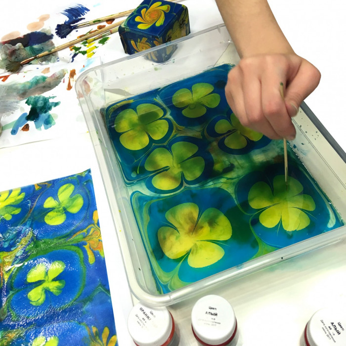На поверхности специально подготовленного раствора с загустителем с помощью кисти, гребня, палочек и, конечно же, красок выводить авторские узоры. А когда картина готова, ее можно перенести на выбранную поверхность, чтобы сохранить получившуюся красоту надолго.