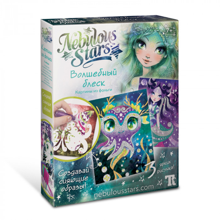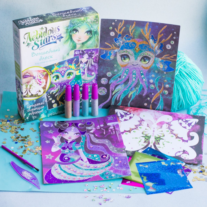 Галактика Nebulous Stars - это сказочный мир творчества и волшебства! Девочки готовы приоткрыть завесу тайны и раскрыть секреты космической силы и магии, проводить тебя в мир добра, красоты и положительных эмоций! Декорирование картины фольгой – творческое, увлекательное занятие. Волшебный блеск оригинальной картины, сделанной своими руками, завораживает и пленит. В наборе: 3 картины с клеевой основой, 6 листов фольги, 4 глиттерных маркера, набор страз, кисточка, инструмент для нанесения фольги, инструкция, история звезды Маринии.