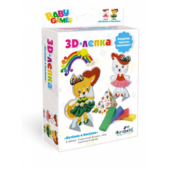 Набор ORIGAMI научить малыша лепить и создавать необычные поделки. В составе: 3 картонные фигурки, стек и 6 брусочков пластилина. А еще подарок: необычная пирамидка! С помощью такого комплекта малыш разовьет мелкую моторику, фантазию и усидчивость.
