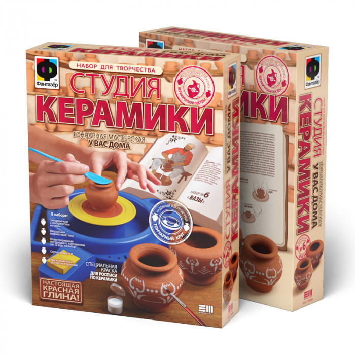 В комплект входит гончарный круг – почти такой же, каким пользовались наши предки тысячи лет назад, только с электрическим мотором, - настоящая красная глина, скульптурный стек, кисть и специальная белая краска для росписи по керамике.