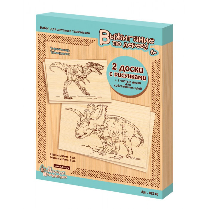 Загадочный мир динозавров всегда притягивает к себе детское внимание, особенно мальчиков. Они очень любят рисовать, лепить и выжигать этих доисторических существ. Поэтому в "Десятом королевстве" создали еще один отдельный набор дощечек с рисунками для выжигания и назвали его "Тираннозавр, Трицератопс".