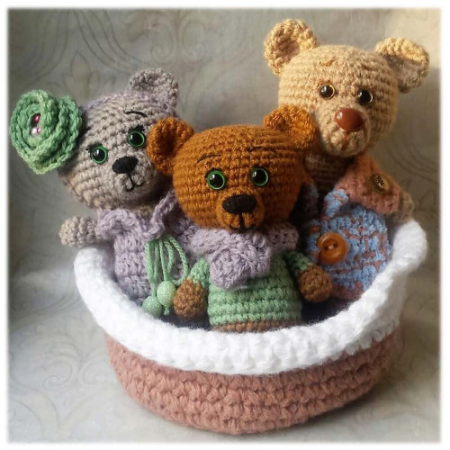 Семья добродушных вязаных мишек-скандиначиков живет в уютной корзине.