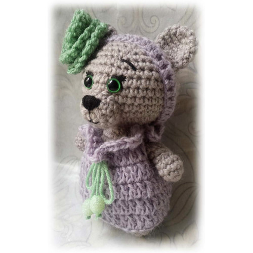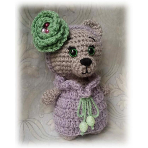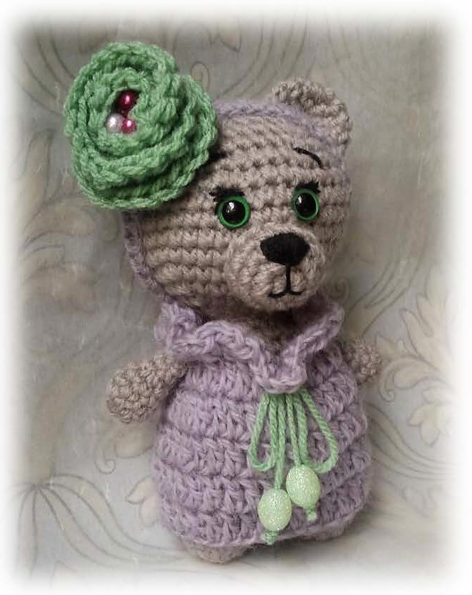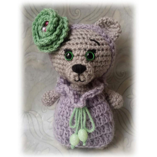 Красавица и умница Мама Медведица в светло-сиреневом шерстяном платье и повязке с крупной розой, подчёркивающей красоту зеленоглазки. Все элементы одежды снимаются.