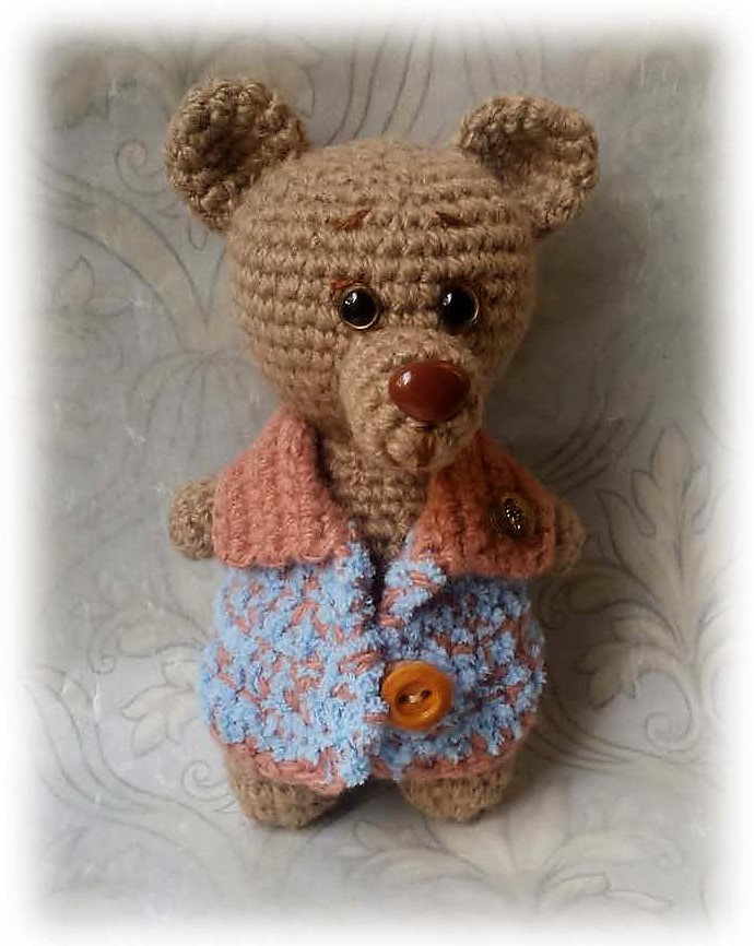 Мудрый и добрый Папа Медведь носит тёплый плюшевый жилет, который застёгивается на лакированную деревянную пуговку и украшен золотой пуговкой-брошкой.