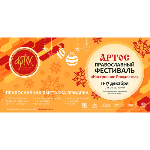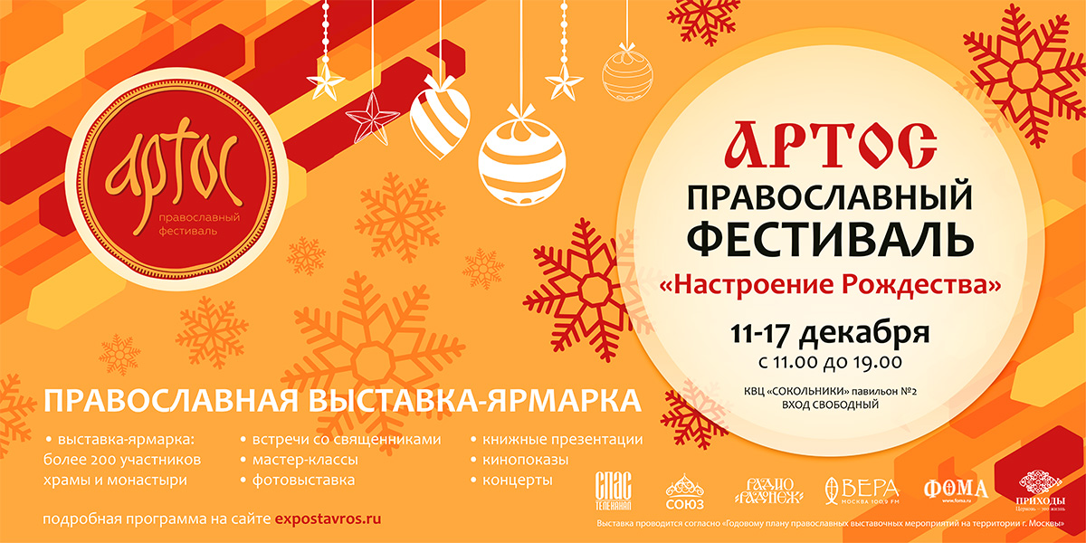 С 11 по 17 декабря 2018 года в Москве пройдет XV Международный православный фестиваль «Артос: настроение Рождества», посвященный семье и семейным ценностям. Маленьких гостей ждут кукольный спектакль, песочное шоу и мастер-классы по песочной анимации, украшению рождественской выпечки, созданию оригинальных елочных игрушек и открыток. Взрослых – интересные тематические встречи, в которых примут участие протоиерей Артемий Владимиров, протоиерей Андрей Ткачев и протоиерей Александр Тылькевич. На встречах со священниками гости фестиваля смогут задать вопросы о духовной жизни, поговорить о посте и подготовке к празднику Рождества Христова.