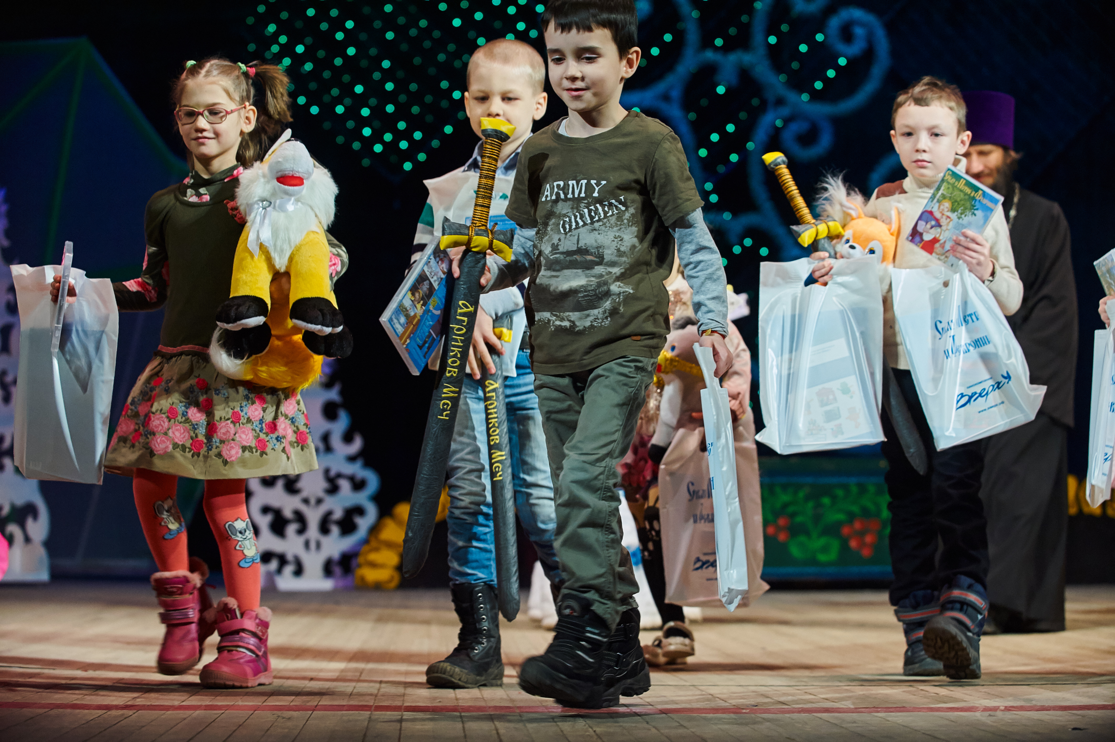 И снова фотомиги Рождественской встречи участников конкурса «Краски России» http://konkurs.empils.ru/! На фото – шести- и семилетние юные художники из г. Ростова-на-Дону: Маркова Диана (6 лет), Шевцова Вероника (6 лет), Григоренко Яна (6 лет), Медведев Сергей (6 лет), Попенкова Анна (6 лет), Гащенко Николай (6 лет), Гащенко Ника (7 лет), Мазий Алина (6 лет), Грицай Максим (7 лет), Пашкова Вероника, 7 лет. Их рисунки вошли в сотню лучших – дети получили в подарок диск с мультфильмом «Сказ о Петре и Февронии» (генеральный продюсер и режиссер мультфильма – Юрий Рязанов, основатель фонда поддержки развития общества «Наши дети», инициатор конкурса «Краски России»), а также замечательные игрушки. Мальчикам вручили Агриков меч – мягконабивное оружие для юных богатырей.