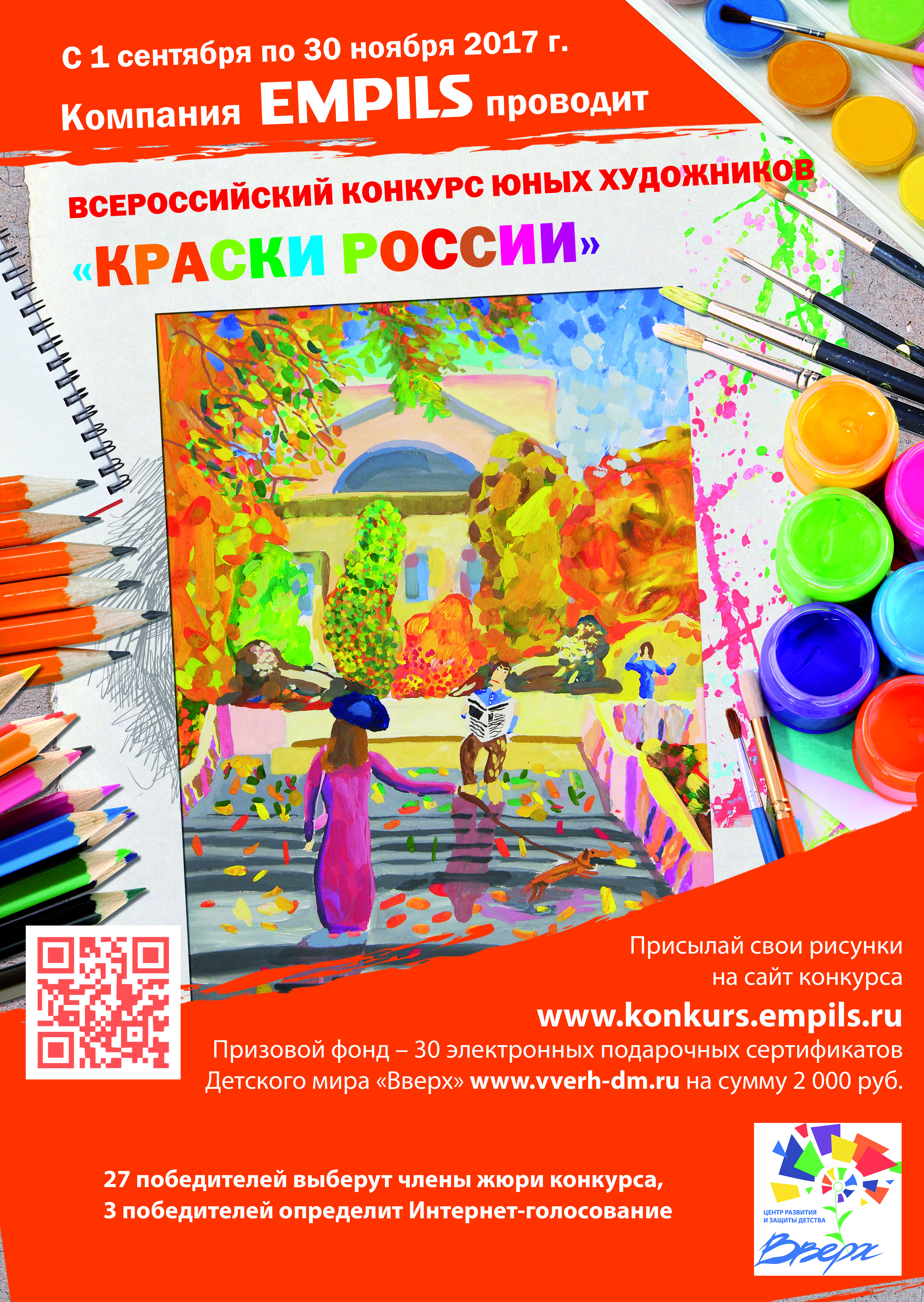 Всероссийский конкурс юных художников «Краски России» http://konkurs.empils.ru/ начнет прием конкурсных работ уже совсем скоро - с 1 сентября 2017 г. Поторопитесь! Конкурс «Краски России» - детское творчество о любви к Отечеству, к своим близким, к друзьям, к своим соотечественникам, к меньшим братьям, к природе, а главное – о любви к добру. «Краски России» - возможность делиться друг с другом творческим опытом, знакомиться с коллегами по кисти, общаться и радоваться творческим успехам друг друга. И не важно, где вы живете: в маленькой деревеньке или в мегаполисе, в столице России или в отдаленных регионах нашей необъятной Родины. Конкурс «Краски России» призван объединить тех, кто искренне желает сделать мир хотя бы чуточку добрее.