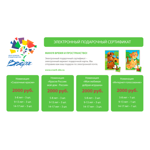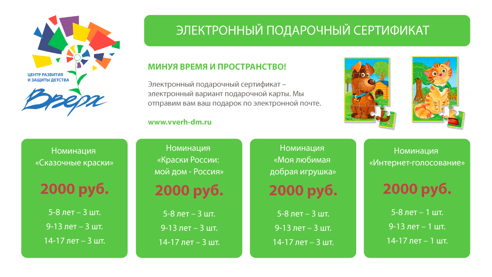 - Победители конкурса получат по электронной почте, указанной при регистрации на сайте, Почетные грамоты и электронные подарочные сертификаты Интернет-магазина детских товаров «Вверх» http://vverh-dm.ru/ на сумму в 2 000 руб. Доставка подарков из Интернет-магазина до победителя конкурса осуществляется транспортными компаниями за счет средств победителя. Стоимость доставки зависит от веса, габаритов груза и от месторасположения получателя. При отсутствии у победителя возможности оплатить доставку подарка возможен вариант уменьшения суммы закупки на сумму, равную стоимости доставки, например: 1 700 руб. – бюджет на закупку подарков, 300 руб. – на доставку.