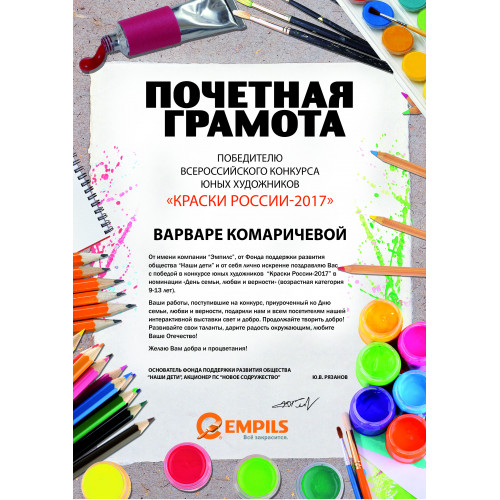 - Организует конкурс отечественный производитель лаков и красок – предприятие «Эмпилс»- при поддержке общественного деятеля, генерального продюсера анимационного фильма «Сказ о Петре и Февронии», основателя Фонда поддержки развития общества «Наши дети», основателя журнала для подростков «Вверх», основателя кинофестиваля «Вверх» и кинозала для семейного просмотра, акционера Промышленного Союза «Новое Содружество» (ООО «КЗ «Ростсельмаш», ЗАО «Эмпилс» и др.) Юрия Викторовича Рязанова.