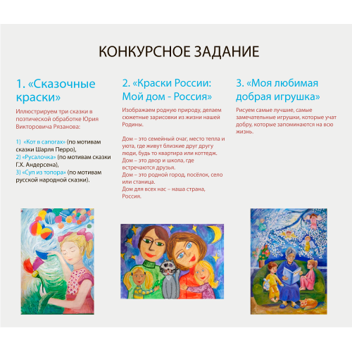 В дополнение для творческого осмысления предлагается еще две темы: «Моя любимая добрая игрушка» (именно добрая, давайте попробуем вместе с нашими детьми осмыслить эту тему) и «Сказочные краски»: создаем собственные творческие иллюстрации к трем известным сказкам, творчески осмысленным Юрием Викторовичем Рязановым (аудиоверсии можно найти на сайте конкурса в разделе «Конкурсное задание»):