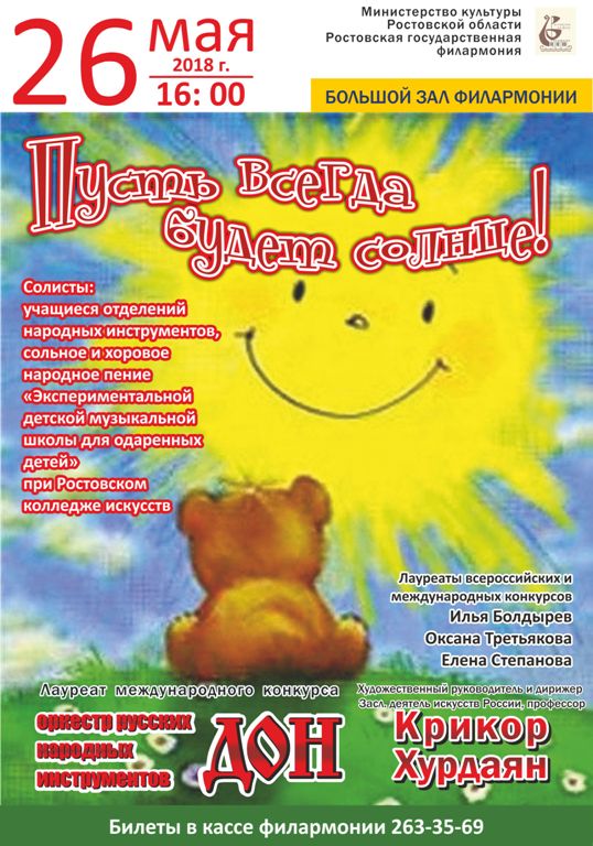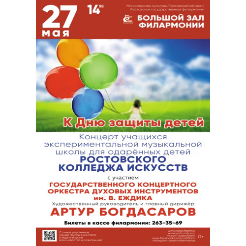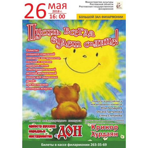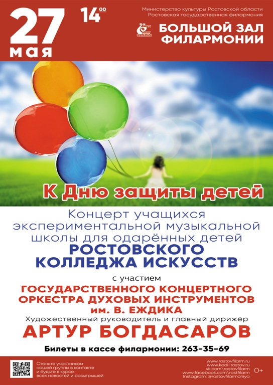 В грядущие выходные в Ростовской государственной филармонии состоится два концерта, посвященных Дню защиты детей. 26 мая – концерт оркестра русских народных инструментов «Дон». 27 мая – концерт учащихся Экспериментальной музыкальной школы для одаренных детей Ростовского колледжа искусств, которые выступят совместно с Государственным концертным оркестром духовых инструментов им. Владимира Еждика.