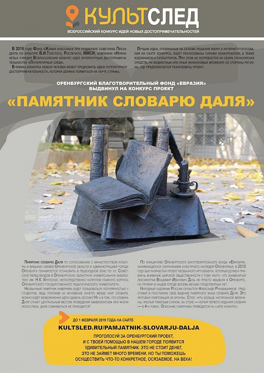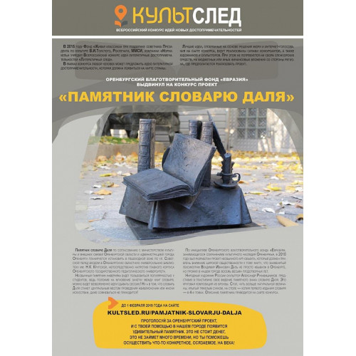 Идею создать памятник словарю Даля предложил Оренбургский благотворительный фонд «Евразия». Проект стал победителем Всероссийского конкурса интересных достопримечательностей «Культурный след». Установят новый арт-объект возле областной библиотеки Оренбурга.